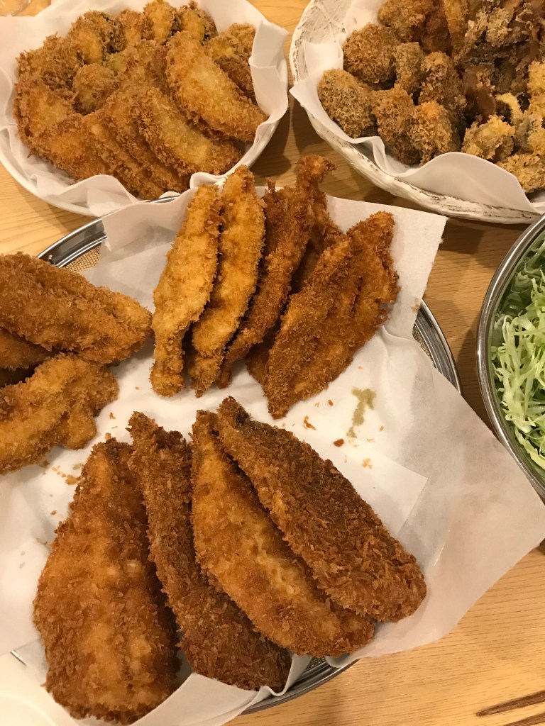 揚げ物は天ぷらでもフライでも、これだけの量を作ります。手前がササミフライ、左奥が玉ねぎエリンギ。右奥が椎茸と舞茸。最奥に唐揚げ。これにサラダに野菜スープと大根おろしがつきます。