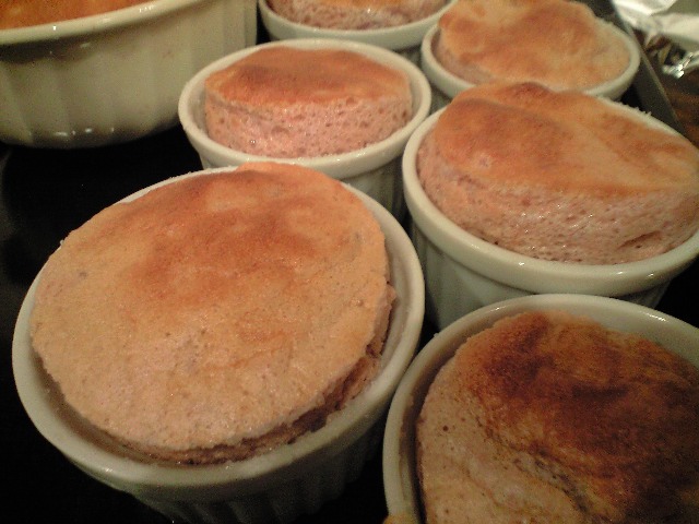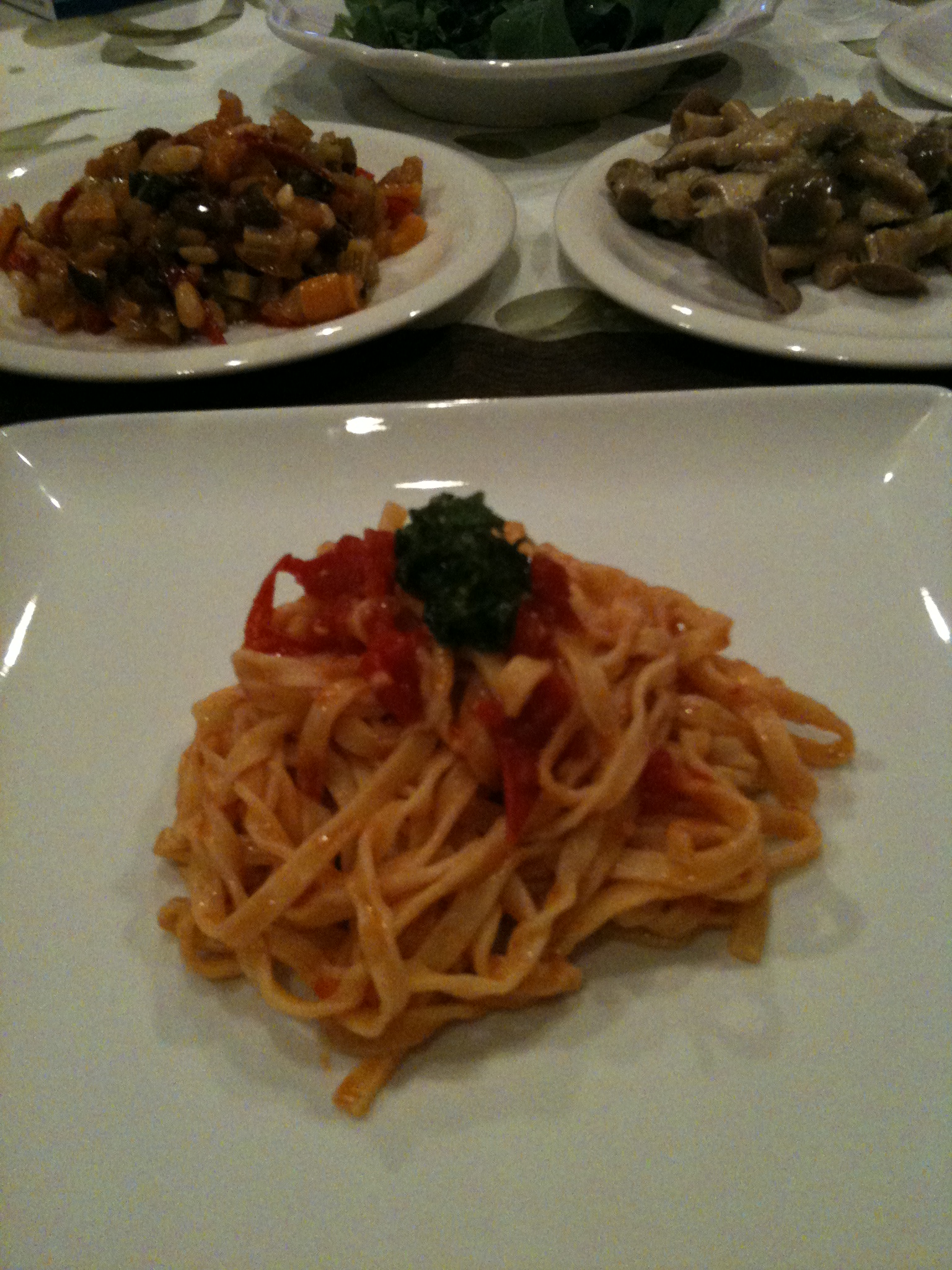 左からイチゴのスフレ。ニンニクとタカの爪のトマトソースと手打ちタリアッテレ、カポナータ、キノコのレモンマリネ・野菜。
