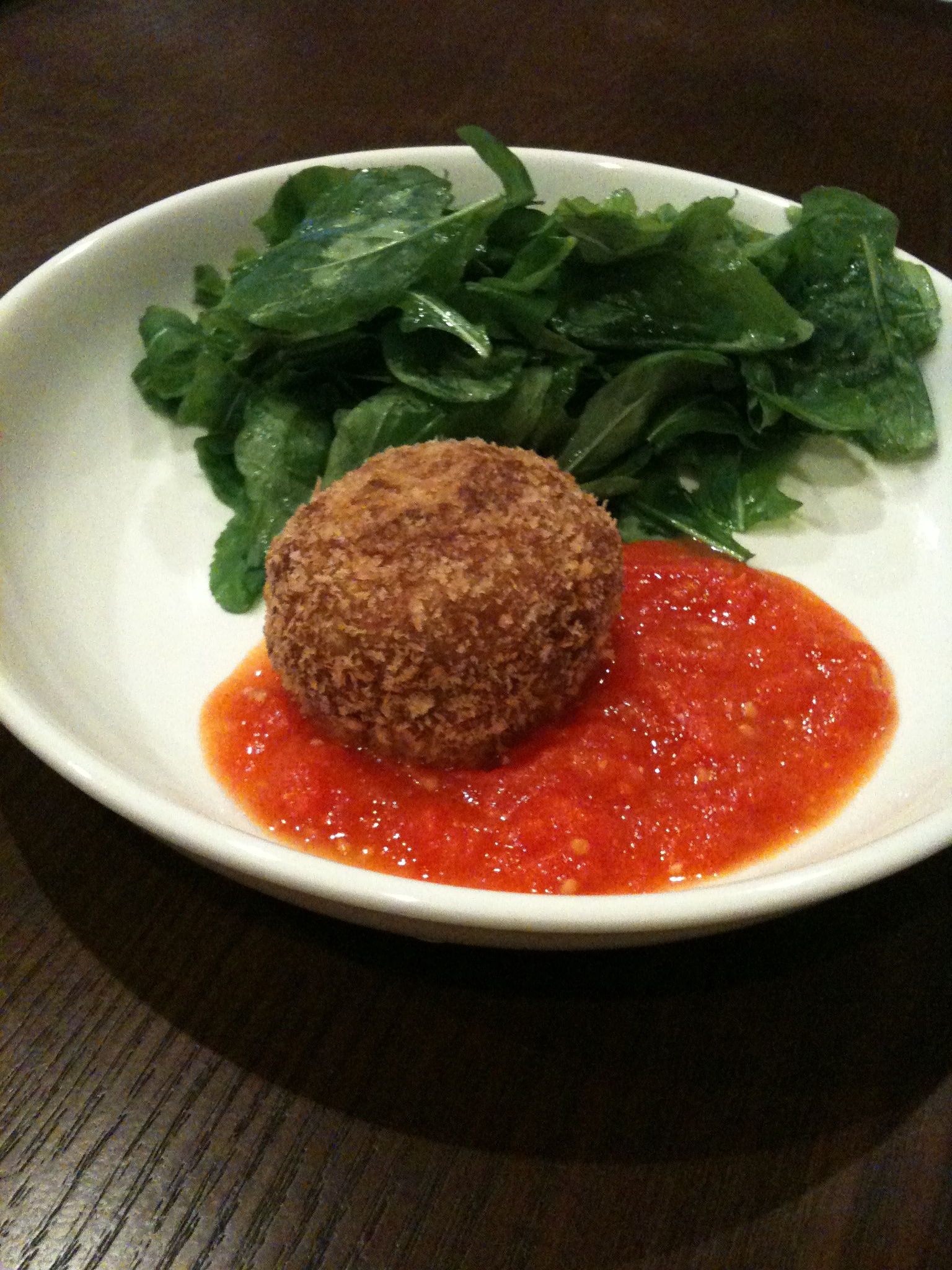 次の日は、残ったトマトソースにアランチーニ(ライスコロッケ)とルッコラサラダ。レモンのクレマ。