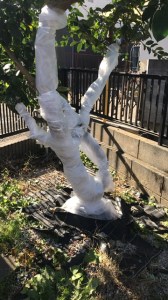 外にあるレモンにも不織布を重ねて巻き付けていますが、本来は上から全体を覆う様に大きな白い綿あめのような感じで、風よけと防寒対策が必要らしいです。