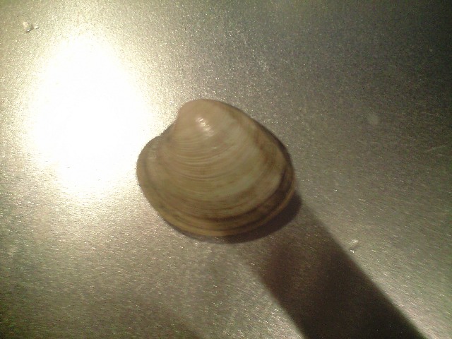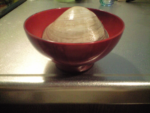 寸法記入できれば良いのですが、料理中にそんなことできません。左右のハマグリ(ここまで大きいとボンビノス貝かも)同じものですが、左は小さく見えます。