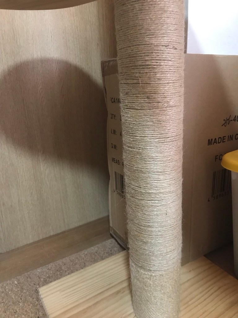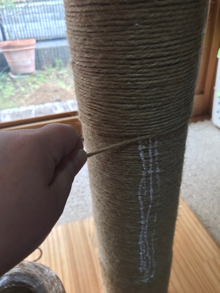 愛猫のキャットタワーの麻紐がボサボサになり、紐が解れてきてしまった。写真は修復し終わったもの。