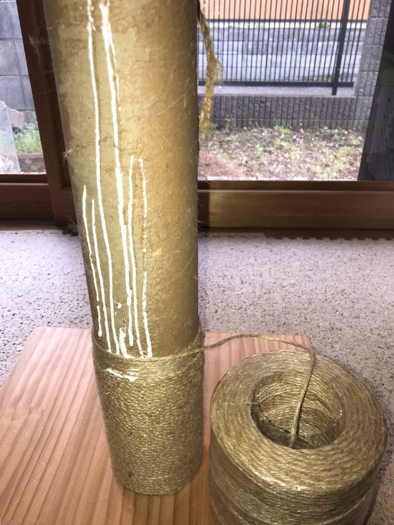 ボサボサになった部分を剥がします。愛猫が爪とぎしない角度にボンドを塗って麻紐を巻いていきます。