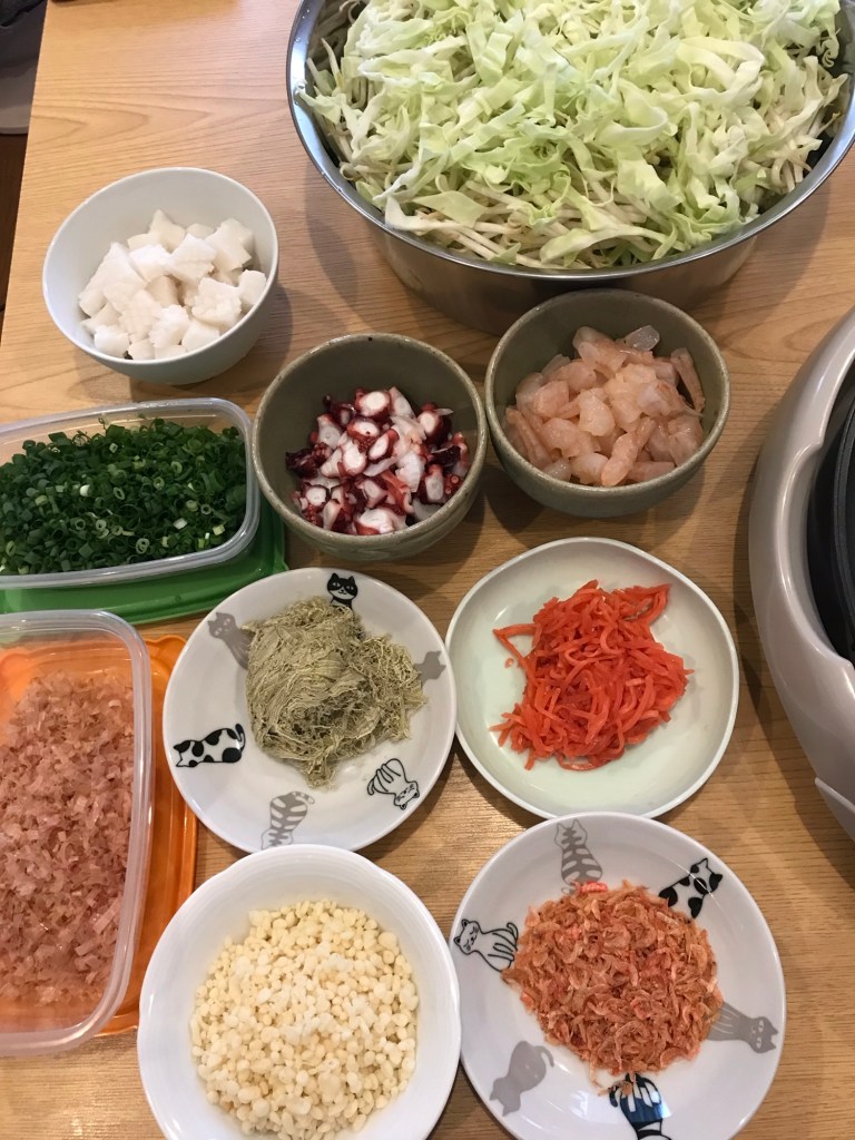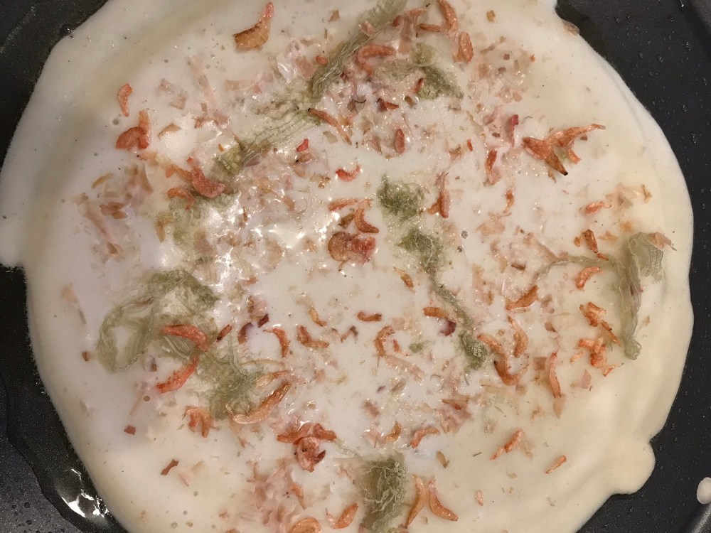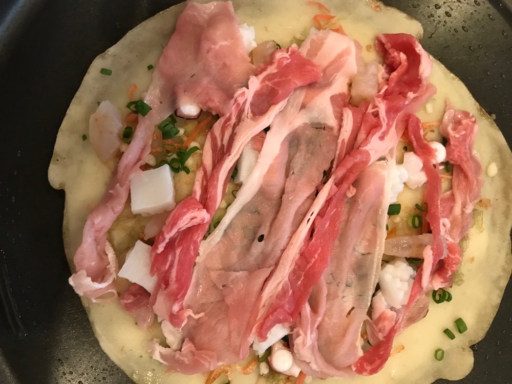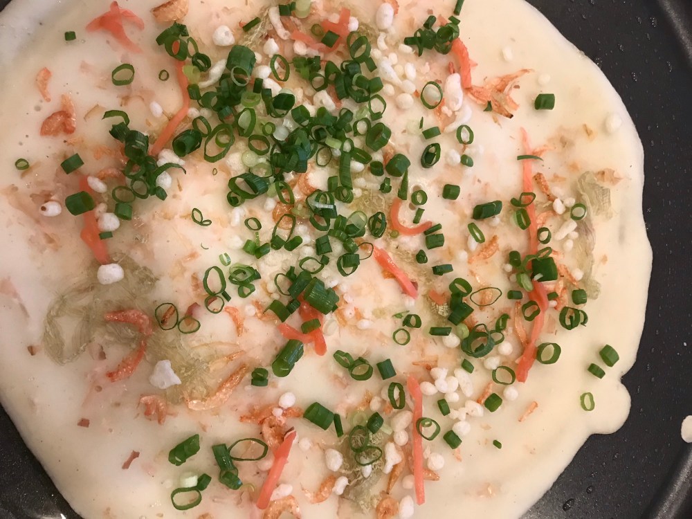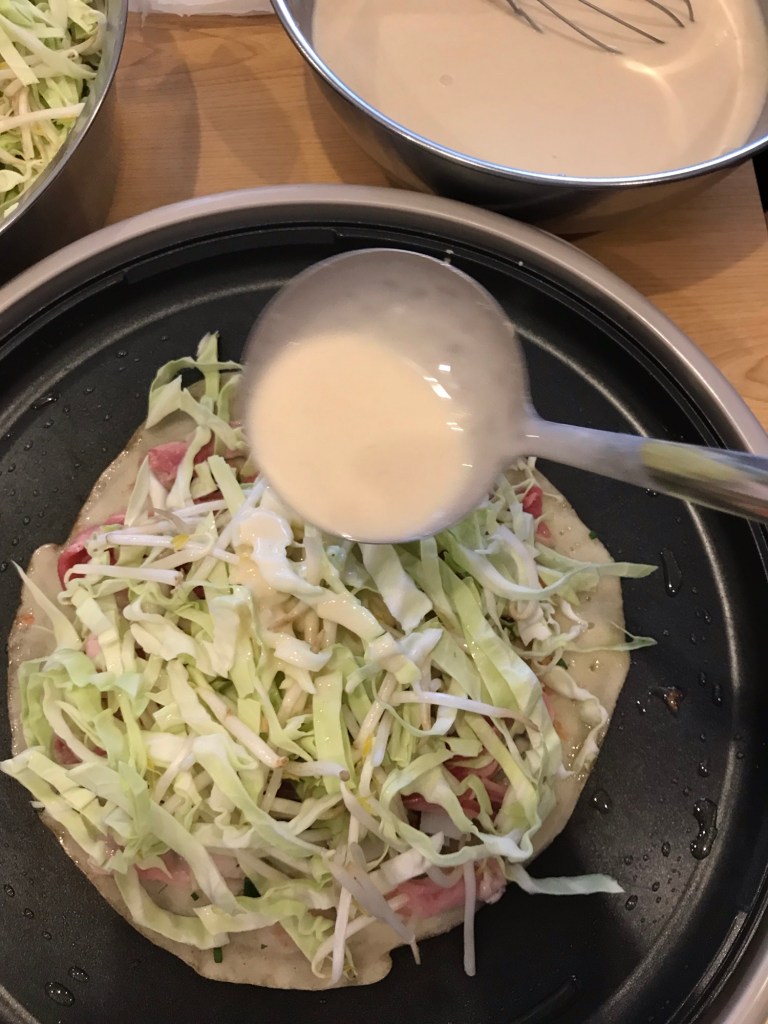 この時点では水分が卵と白出汁と水の分量になる。関東のお好み焼きより水分は多い。