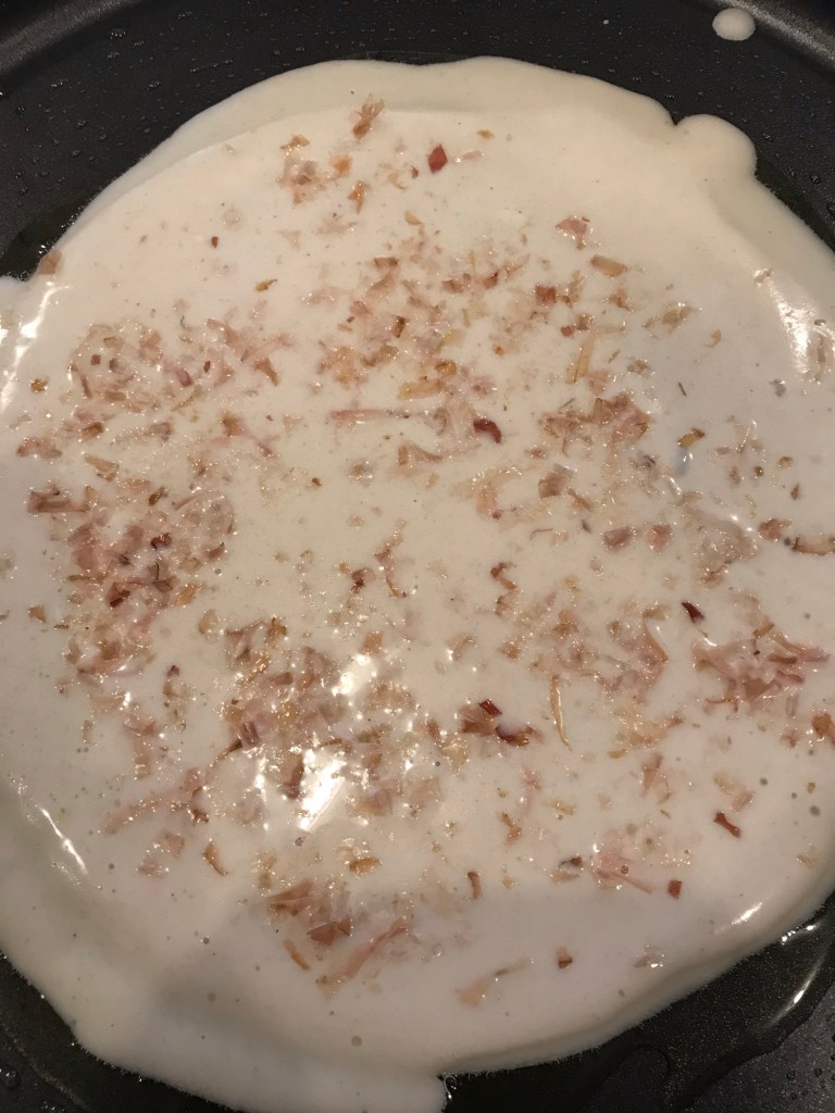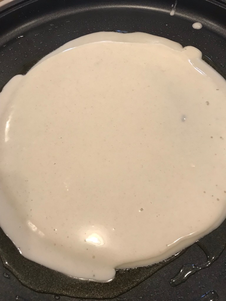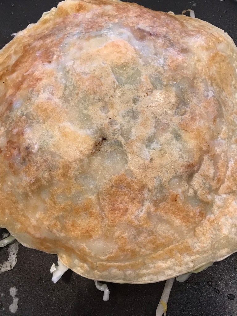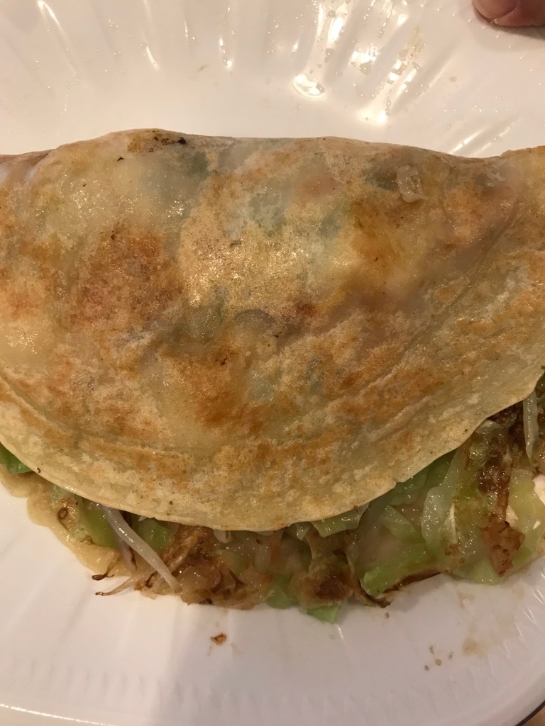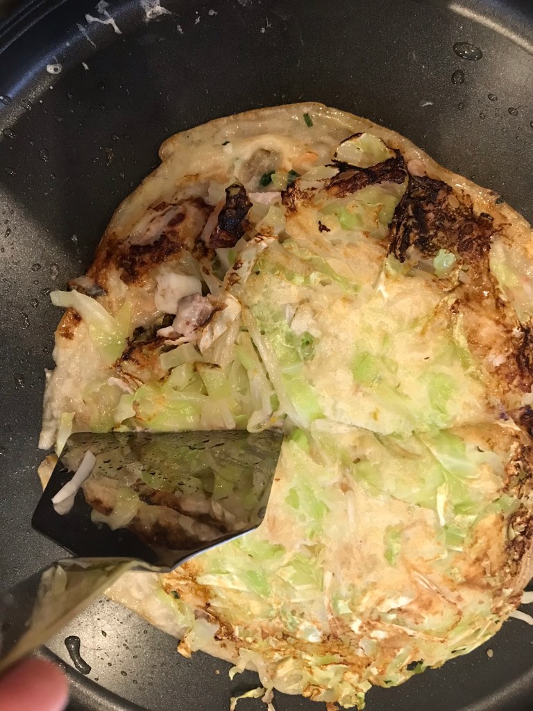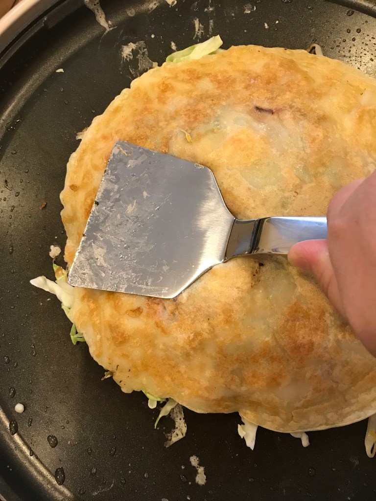 集中力と技量が必要な技でした。私にはないので、一回り小さく作ってコテ返し。それでも、大人の男性でお腹いっぱいになるらしい量。