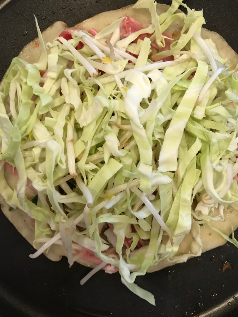⑫ もやしとキャベツが混ざり合う様にほどほどに盛り付けます。