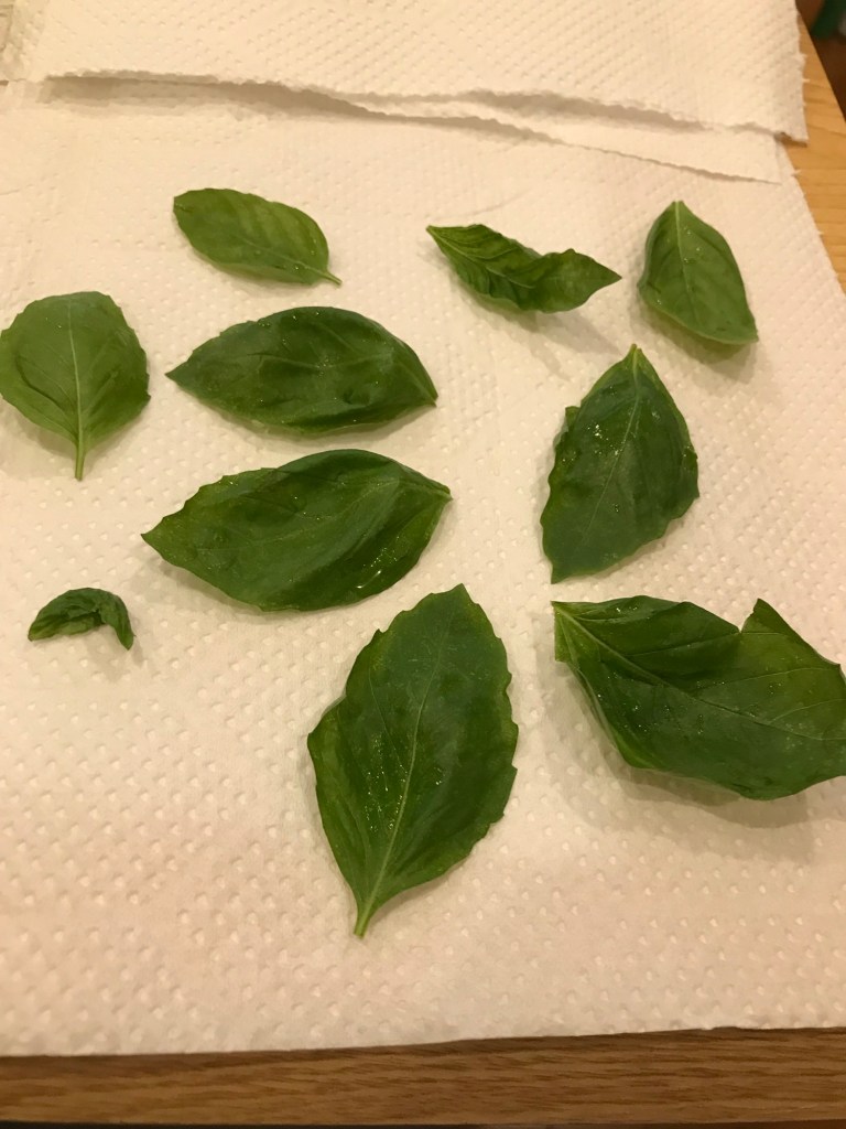 バジルの葉っぱもサッと水で洗い、キッチンペーパーで水気を取っておきます。