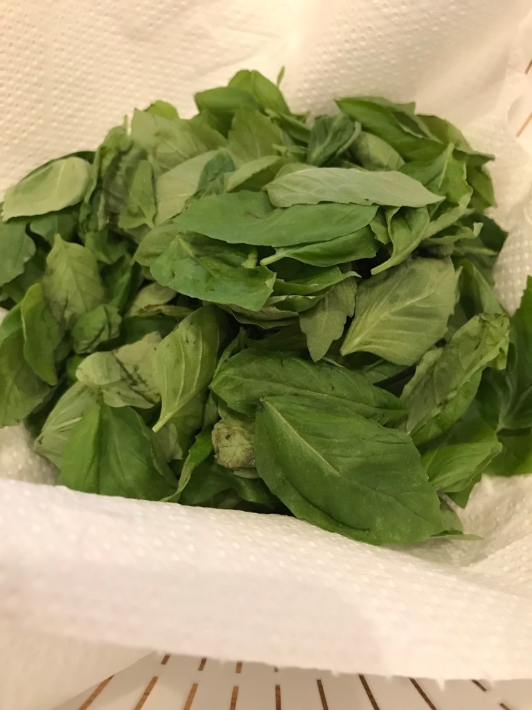 洗ったバジルの葉っぱを拭いて乾かすと、写真のような状態になります。