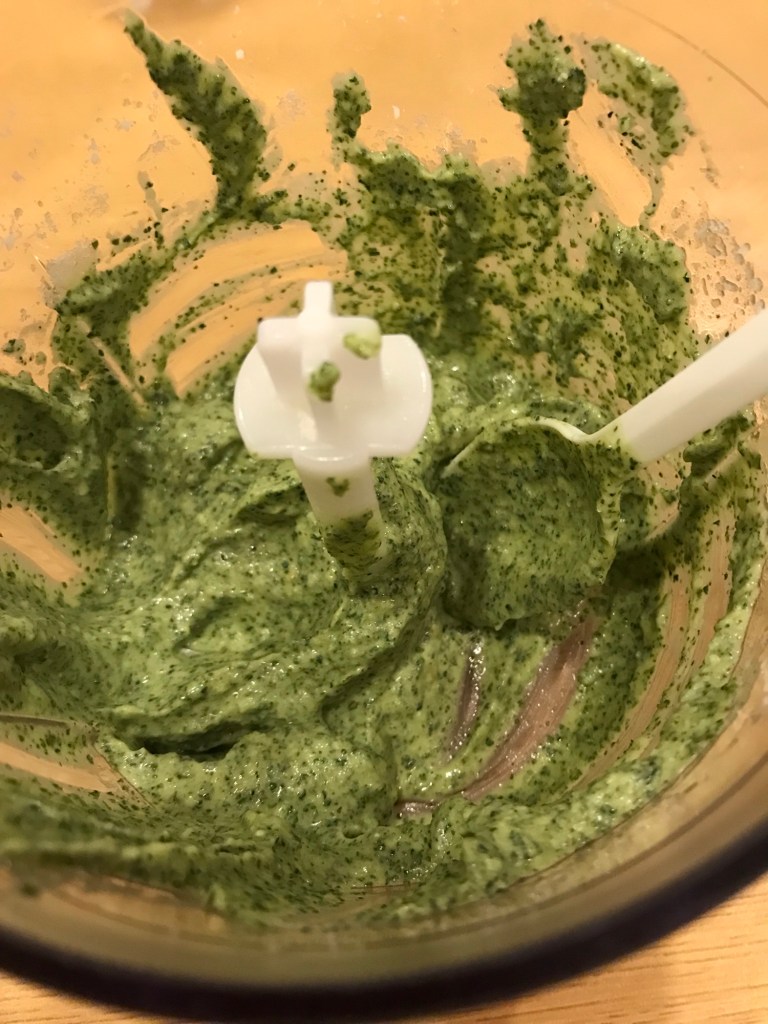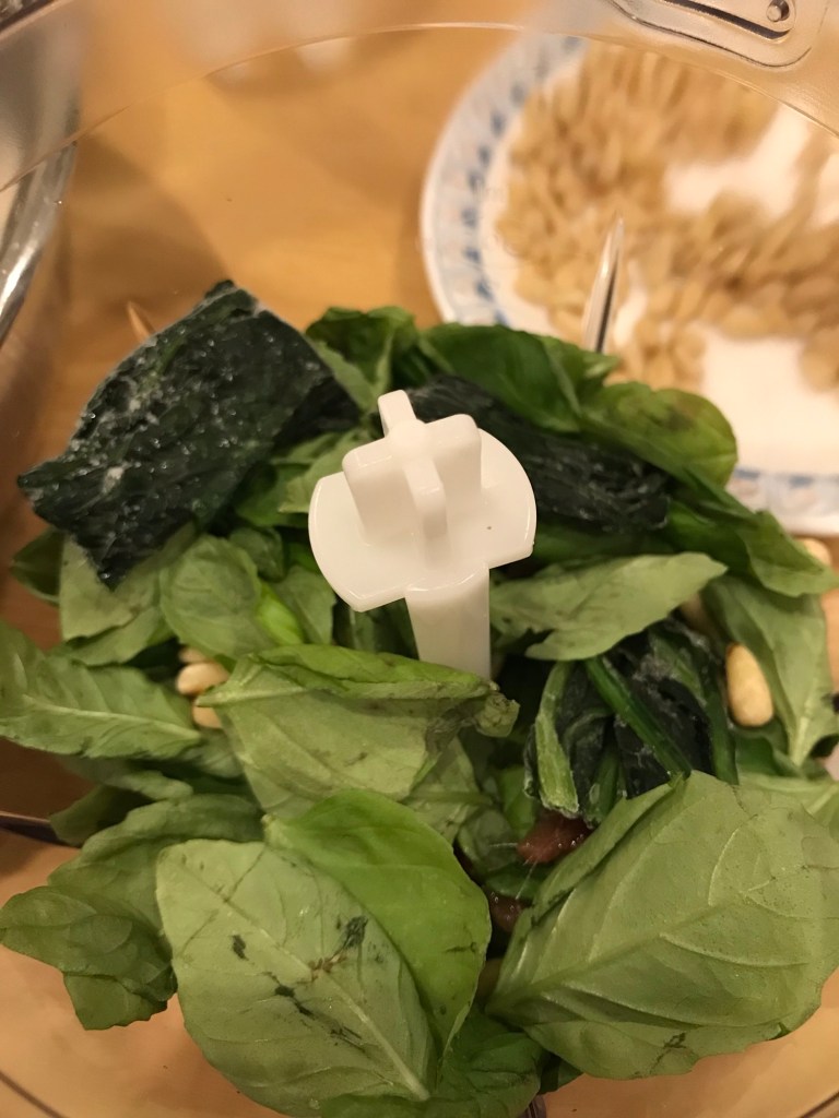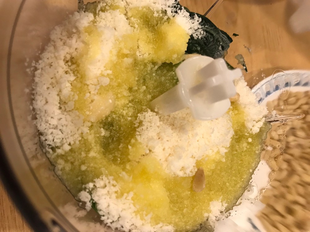 ミキサーにバジルの葉っぱ・松の実・凍らせたホウレン草・アンチョビ・パルメジャーノレジャーノとEXオリーブオイルを入れます。