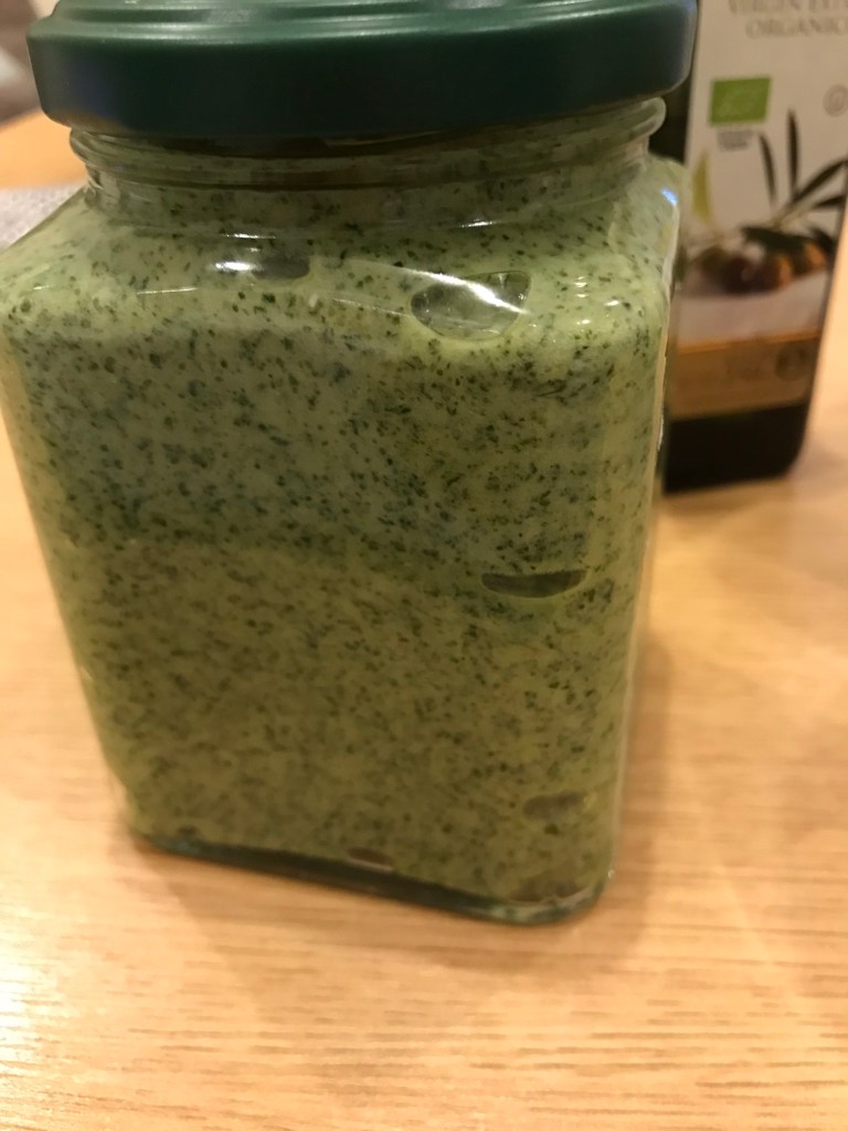 写真の煮沸乾燥させたジャム瓶に入っているのが、ニンニク不使用のジェノベーゼ。